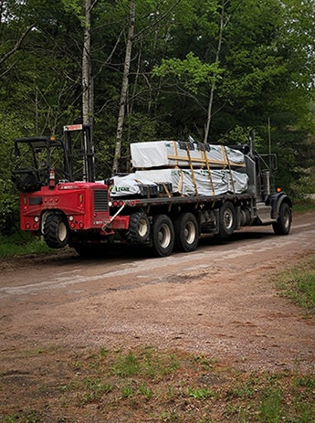 For an extra fee of $800, we'll provide a truck with an off-road forklift or crane, or a tilt bed wrecker, to put kit(s) as close as possible to your build site, still wrapped up in its weather resistant tarps.