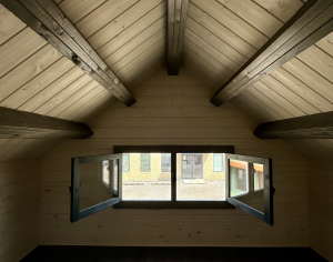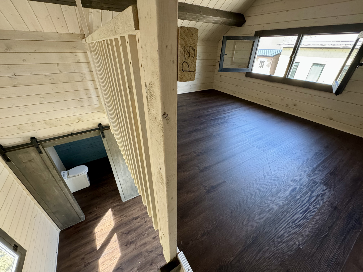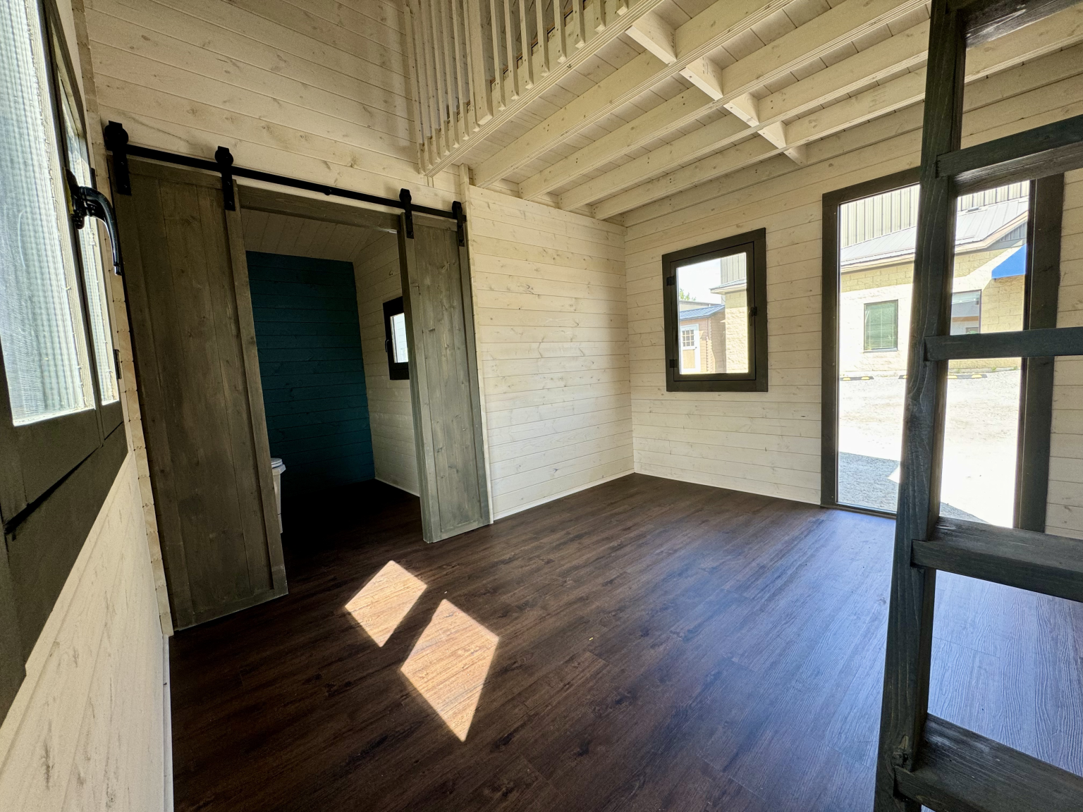 The main living area feels bright and open, complete with a loft above for sleeping or relaxing. What makes the Alcove unique is the extra 39.98 ft² room that comes with a barn door – a practical addition that can be finished as a: