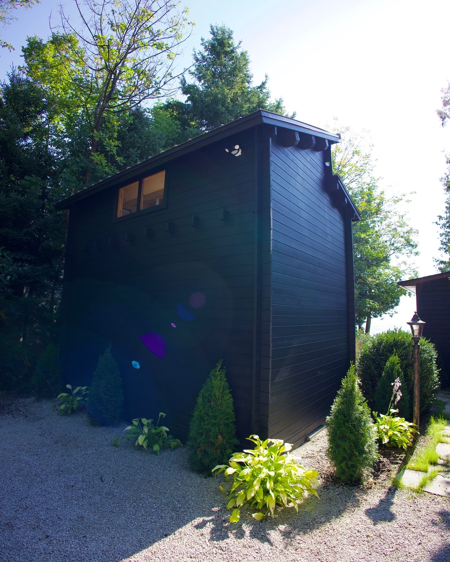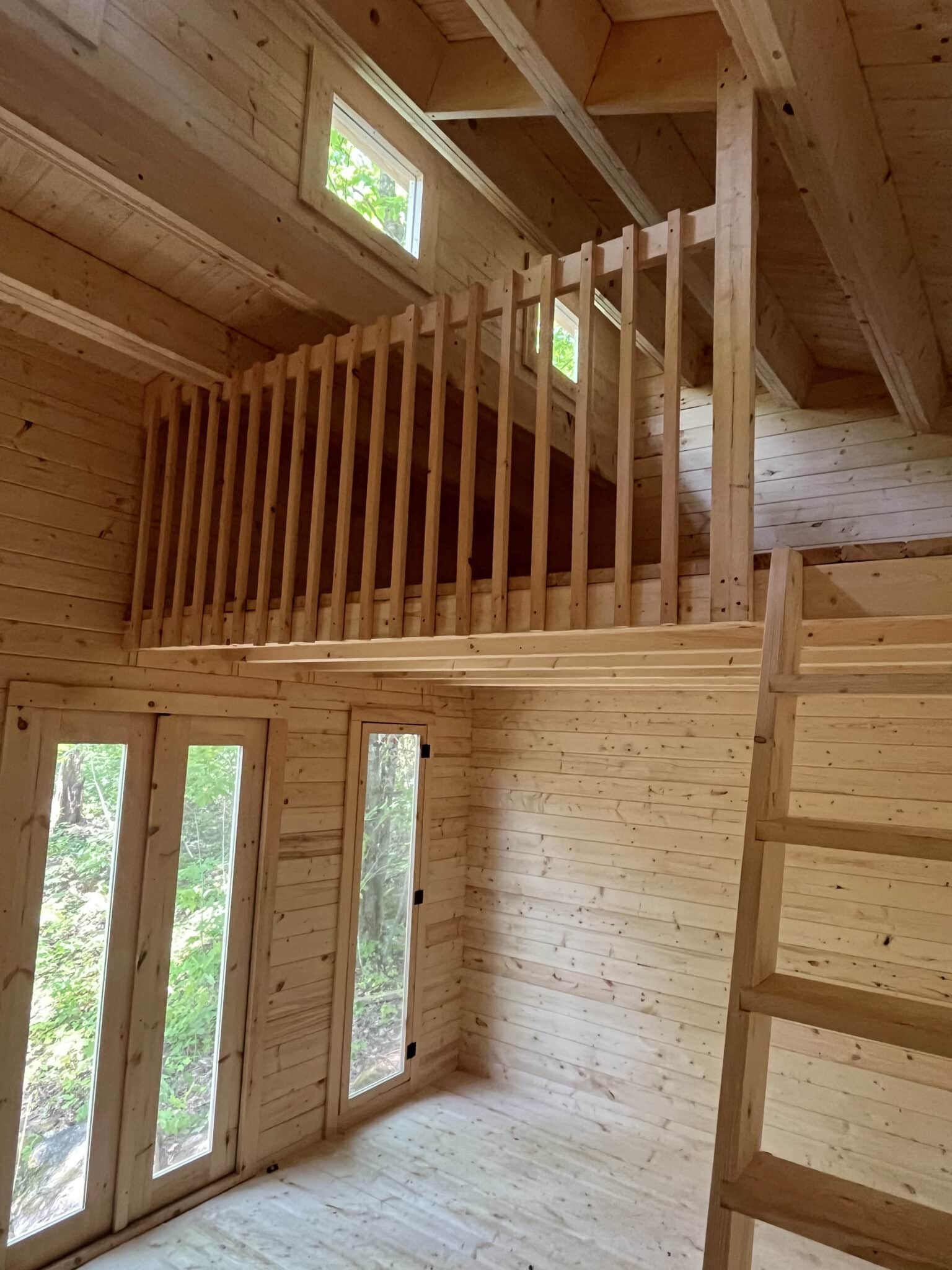 This modern bunkie is now available in 160 sq ft on the main level with an added loft of 141 sq ft. It features extra tall windows and sleek lines. The extra tall ceiling and upper windows add to the spaciousness of this bunkie. All the windows are perfect for a beautiful view. (Extra window installed by owner above front door in pic. Extra windows are available for order.)