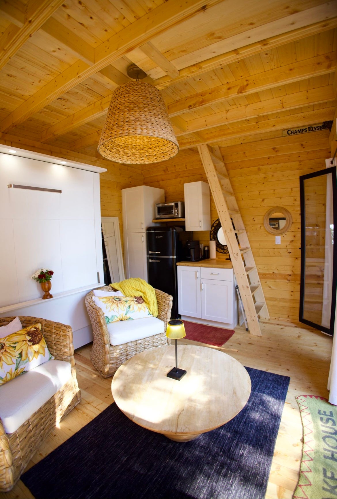 This modern bunkie is now available in 199 sq ft on the main level with an added loft of 181 sq ft. It features extra tall windows and sleek lines. The extra tall ceiling and upper windows add to the spaciousness of this bunkie. All the windows are perfect for a beautiful view.