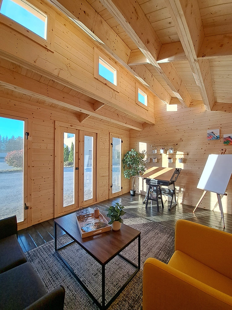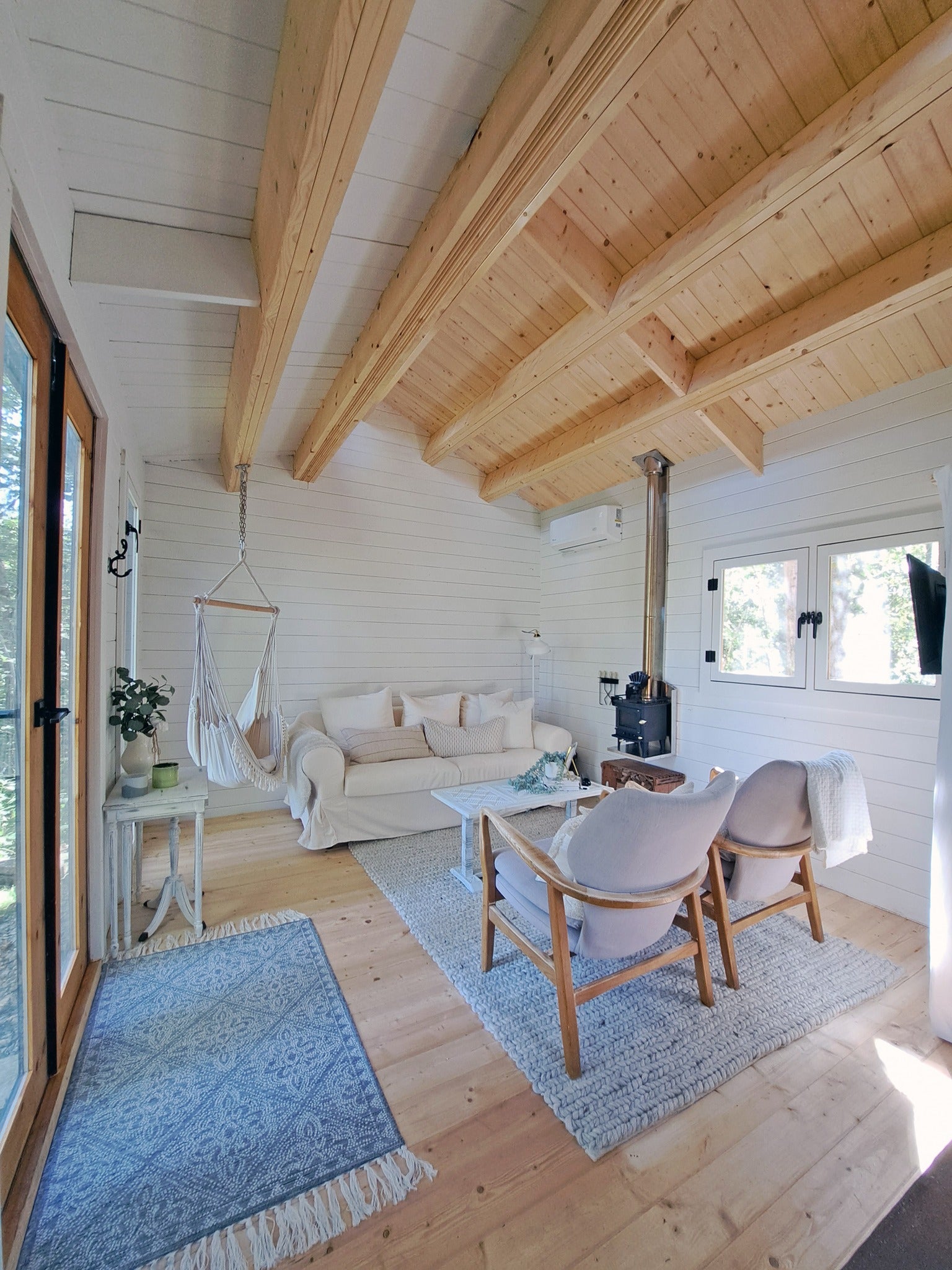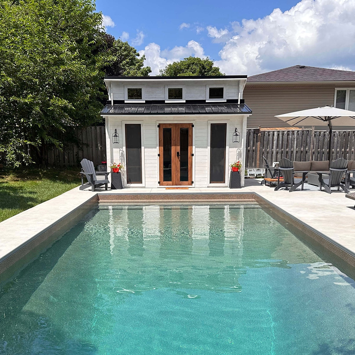 This modern bunkie has 160 sq ft of space with extra tall windows and sleek lines. The extra tall ceiling and upper windows add to the spaciousness of this bunkie. All the windows are perfect to showcase a beautiful view.